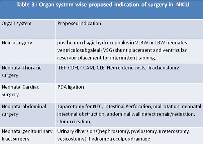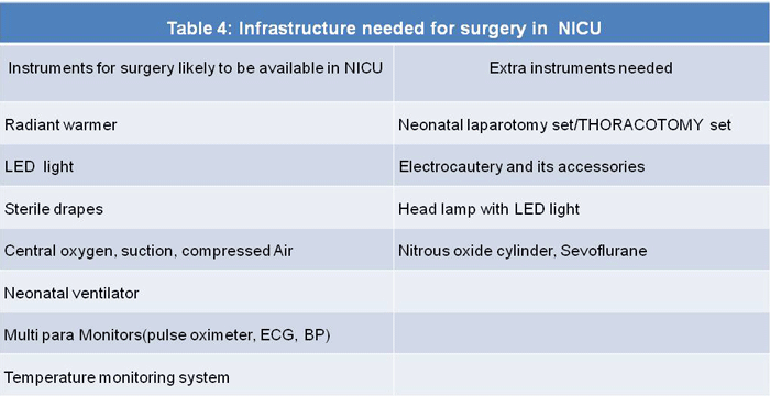 Almost all the NICU have certain basic instruments which are routinely used. These non consumable instruments can be used for surgery also (Table 4). As apparent from the table, very few extra instruments/ infrastructural changes are needed to perform surgery in NICU. All future NICU planners must integrate OT, equipped with the common surgical consumables in NICU.