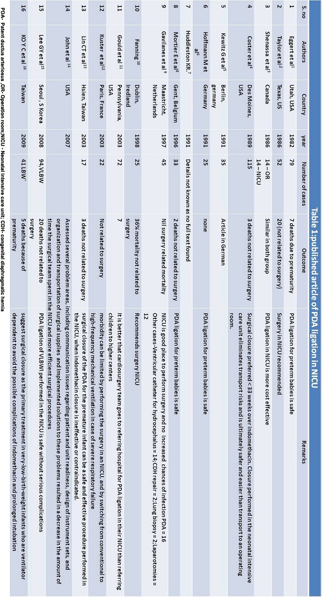 A review of the literature suggest that the since the publication of abdominal laparotomy drain for NEC in 1977 [15] and ligation of patent ductus arteriosus (PDA) in 1982 [1] in NICU, a plethora of surgeries have been performed in NICU. PDA ligation is the commonest surgery that has been safely performed in NICU. The results of PDA surgery are reviewed in Table 1. Since first reported by Eggert et al [1] in 1982 [16], published studies from all around the world (USA, Netherlands, Germany, Taiwan, South Korea, etc.) confirm that a total of 669 neonates with PDA had successful ligation in NICU without any major complication. NICU PDA ligation has been known to be safe as well as cost effective [1-7]. In fact, it is has been reported better than the medical treatment (Indomethacin) [3, 15]. The pediatric cardiothoracic surgical team goes to NICU and performs the surgery avoiding any shifting of the sick neonate, while maintaining the continuity of care (same neonatologist) [9]. In spite of such a large worldwide experience, NICU PDA ligation has not gained universal acceptance as most of the NICU planners do not incorporate the idea of neonatal surgery in intensive units; even basic surgical instruments and not always available in NICU.