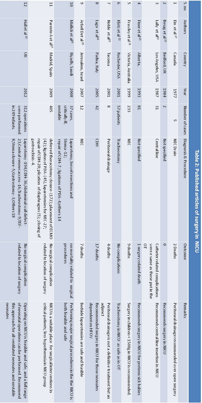 The review of the literature was performed in November 2012 using the Medical Literature Analysis and Retrieval System Online (U.S. National Library of Medicine’s life science data-base; MEDLINE), and Google© search. The MEDLINE search employed both ‘‘MeSH’’ (Medical Subject Heading) and ‘‘free text’’ protocols. Specifically, the MeSH search was conducted by combining the following terms retrieved from the MeSH browser provided by MEDLINE: Intensive Care Units; Neonatal, Neonatal Intensive Care Units; Newborn Intensive Care Units ; Infant, Newborn, Diseases/surgery. Multiple free-text searches were performed applying singularly or in combination the following terms through all the fields of the records: neonatal intensive care unit, neonatal surgery, Laparotomy, patent ductus arteriosus. The related articles related to these searches generated by MEDLINE were also reviewed. Subsequently, the searches were pooled and all articles dealing with surgical intervention of neonates in NICU were included and duplicates were excluded. The authors individually reviewed all the abstracts of the retrieved studies in order to select the papers that were relevant to the review topic. In addition, the reference lists of the included papers were searched for any missing articles. After reviewing the studies, authors analyzed them for indications, results and authors recommendations regarding feasibility of the surgical procedures in NICU. Based upon these authors have also suggested future course of action for further development of this field.
