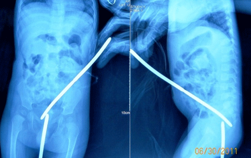 Figure 1: Plain roentgenograms with bougies inserted from sigmoid colostomy and anal opening, revealing a thin membranous rectal atresia. |