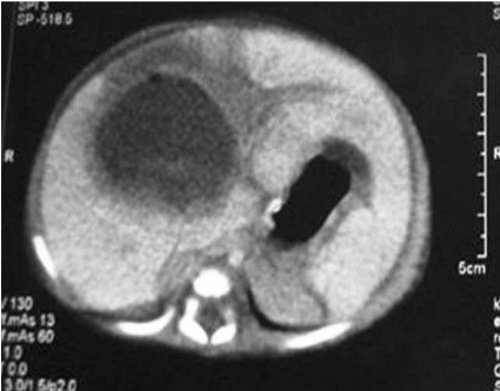 A premature newborn girl born at 33 weeks of gestation, weighing 2250 g was admitted to neonatal intensive care unit (NICU) with hydrops fetalis. Umbilical catheterization was done for IV access and for TPN. Nine days later, baby developed thrombocytopenia, leucocytosis, and abdominal distension. Blood and urine cultures were obtained, but no pathogen was detected. The umbilical catheter was withdrawn as it was thought to be a possible site of infection. Two days after catheter withdrawal, her clinical condition deteriorated. She was dehydrated and had abdominal distention, abdominal tenderness, and hepatomegaly. Bedside abdominal US revealed two compound cystic cavities, measuring 32×18 mm and 11×5 mm. US could not distinguish if these lesions were due to liver abscess, hematoma, or cavernous hemangioma. Laboratory analysis revealed WBC 13.8 103/µL, Hb 9.5 g/dL, PLT 32x103/µL, SGPT 79 U/L, SGOT 230 U/L, LDH 556 IU/L, and CRP 9.46 mg/L. Hemodynamic resuscitation were initiated. Repeat US the next day revealed a single, large, cystic cavity measuring 45×35 mm. Abdominal CT with intravenous contrast confirmed the diagnosis of liver abscess (Fig. 1). Vancomycin (15 mg/kg q6h IV) and meropenem (20 mg/kg q8h IV) were continued. After correction of her anemia, thrombocytopenia, and fluid and electrolyte disturbances, she underwent open surgical drainage of the abscess with lavage of the abscess cavity with warm saline and drainage with a suction drain. Culture of the pus from the abscess was negative. Postoperative recovery was uneventful, drain was removed on 5th postoperative day and baby was discharged on the 18th postoperative day. Regular follow-ups did not show any recurrence with normal ultrasound of liver US at 18 months.