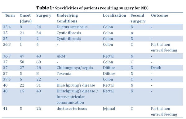 As regards the timing of onset of the disease; contrary to most reports except the cohort reported by Lambert et al, the onset of NEC was slightly delayed in our series. Some authors [4] hypothesize that the early signs could be due to the consequences of a prenatal or an immediate neonatal ischemia, which triggers NEC. In our experience, only a few patients seemed to have experienced early neonatal injury that could have provoked the disease.