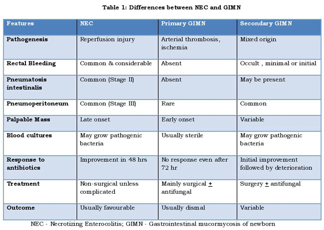Contrary to the foregoing descriptions, Athena is aware of reports describing rectal bleed, [8, 23] pneumoperitoneum [8, 24] and pneumatosis intestinalis [7, 25] in GIMN. Kargl et.al [7] suggested that a thickened bowel in ultrasonography is suggestive of GIMN; but Mohta et.al [23] noted thinning of the intestinal wall during surgery. Based on these paradoxical presentations, Athena believes that there are two forms of GIMN. (Table 1) In primary GIMN, invasive infection occurs when the fungal colonization of neonatal gut exceeds a critical size. This form appears to be extremely rare. In secondary GIMN the fungal infection itself is secondary to the predisposing NEC. Devitalized tissue of NEC provides a good medium for the saprophytic fungi to grow. In secondary GIMN, clinical presentation will, as expectedly, have mixed features of both NEC and GIMN.