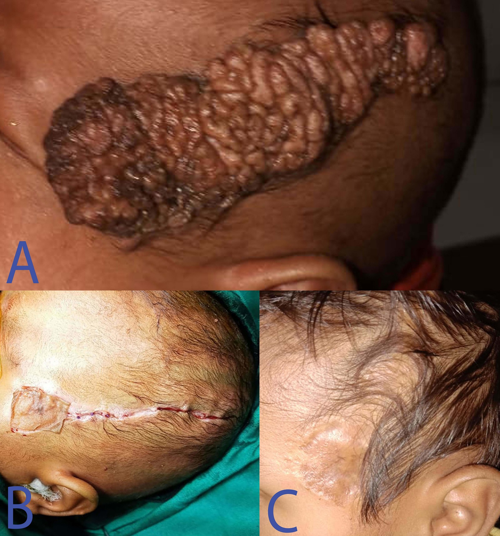 (A) Preoperative image showing cerebriform lesion (B) Peroperative image (C) Follow-up at 2 years showing a healed wound with acceptable scarring. |