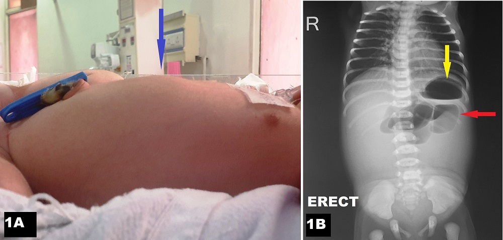 A preterm, low birth weight (2450gram) baby born to a primigravida mother was brought to the emergency department with bilious vomiting, abdominal distension, and refusal to feed on day 3 of life. There was a history of the passage of meconium and urine on the same day of birth. On clinical examination, there was abdominal fullness (Fig. 1A). The antenatal scan done during the third trimester showed polyhydramnios. There was no history of maternal smoking or medications except for iron and folic acid supplementation. X-ray abdomen erect revealed a gastric shadow with 4-5 air-fluid levels in the center of the upper abdomen with the rest of the abdomen gasless (Fig. 1B). The patient was resuscitated with intravenous fluids and broad-spectrum antibiotics. The complete blood count, liver and renal function tests were well within the normal range. On radiological and ultrasonography evaluation there were no components of VACTERL. The baby was kept nil per orally, along with nasogastric tube was placed and planned for emergency surgery.
