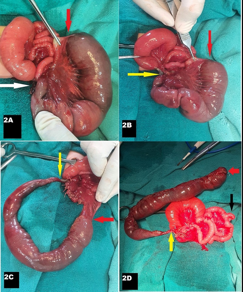 On exploratory laparotomy, there was type-I jejunal atresia (red arrow) and knotting of proximal dilated jejunum with distal unused ileum (yellow arrow) at 30cm and 15cm from duodenojejunal junction respectively (Fig. 2A). There was another atresia over proximal dilated jejunum at the site of knotting and formation of blind loop segment of jejunum between two atretic areas (Fig. 2B,2C). The knotting was released and the blind loop segment of the jejunum was resected with atretic areas (15cm). Distal unused bowel patency was checked. Moreover, there was a wide base Meckel's diverticulum which was left as such.(Fig. 2D). A proximal end to distal cut back jejunoileal anastomosis was done in a single layer with polyglycolic acid (PGA) 5-0 round body interrupted sutures. The postoperative course remained uneventful. The patient was discharged on day 12 after the removal of skin sutures. On three months follow up; the patient is gaining weight appropriate for age (5kg/97th percentile) on exclusive breastfeeding.
