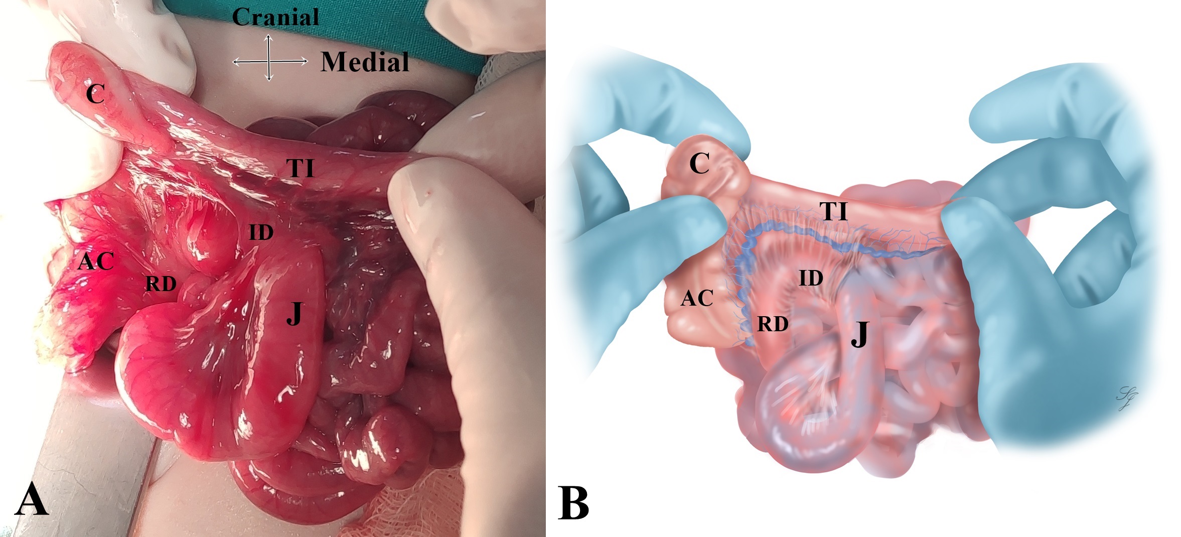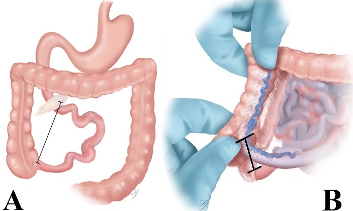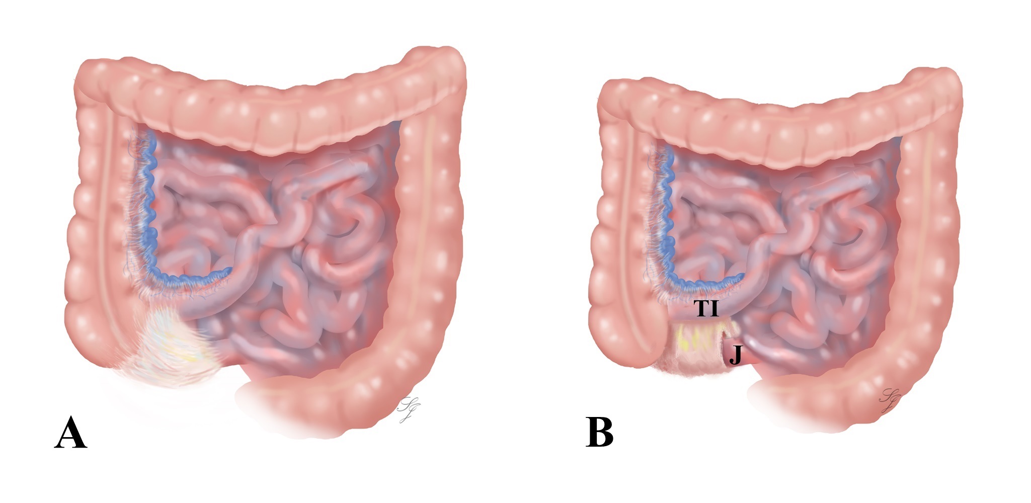 Diagrammatic illustration: A) Intestinal anatomy at first glance. B) Intestinal anatomy after releasing the ileocecal bands. Note that the terminal ileum and the proximal jejunum are almost overlapping. TI: Terminal Ileum, J: Jejunum |