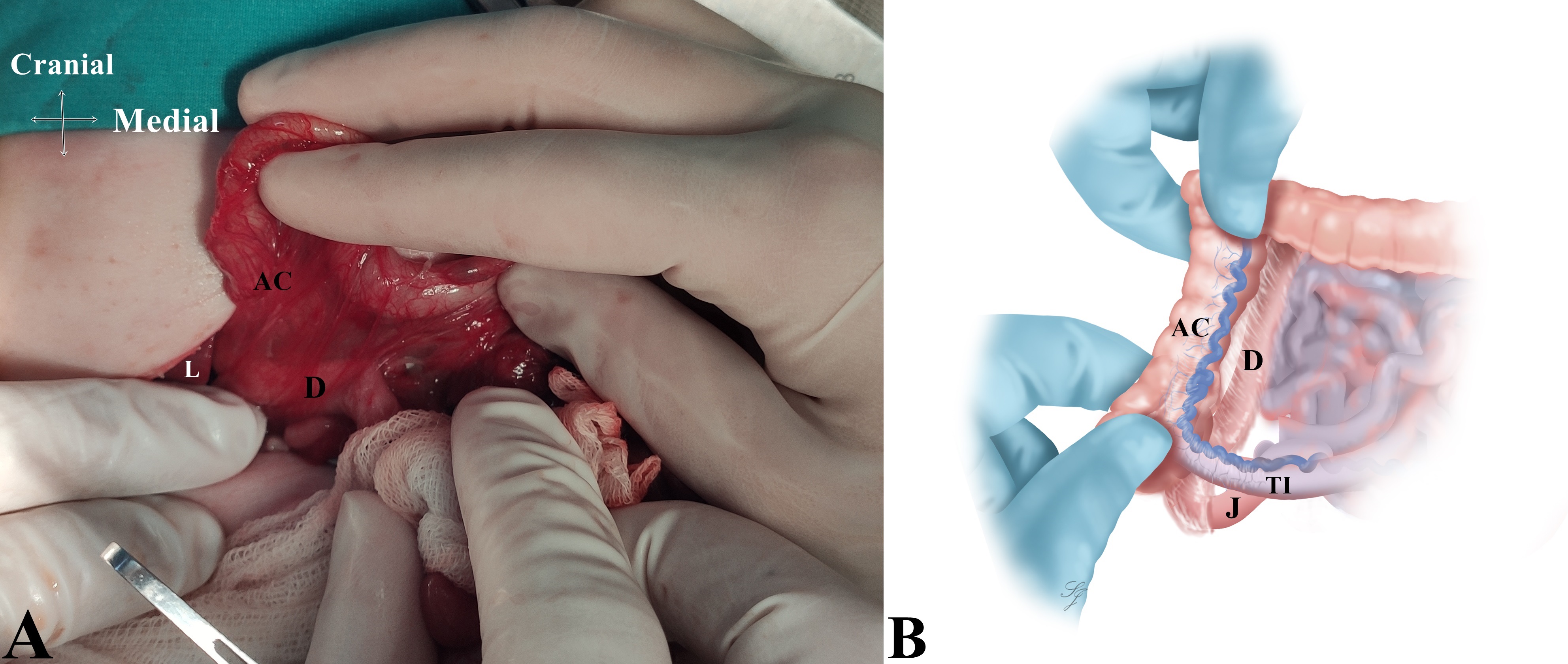 Anatomy of the duodenum within the retrocolic ''sac'': A) Original peroperative photo. B) Diagrammatic illustration. This illustration is not an exact copy of the peroperative photo. It is designed to make the retrocolic and intrasaccular position of the duodenum more understandable. AC: Ascending Colon, D: Duodenum, J: Jejunum, L: Liver, TI: Terminal Ileum. |