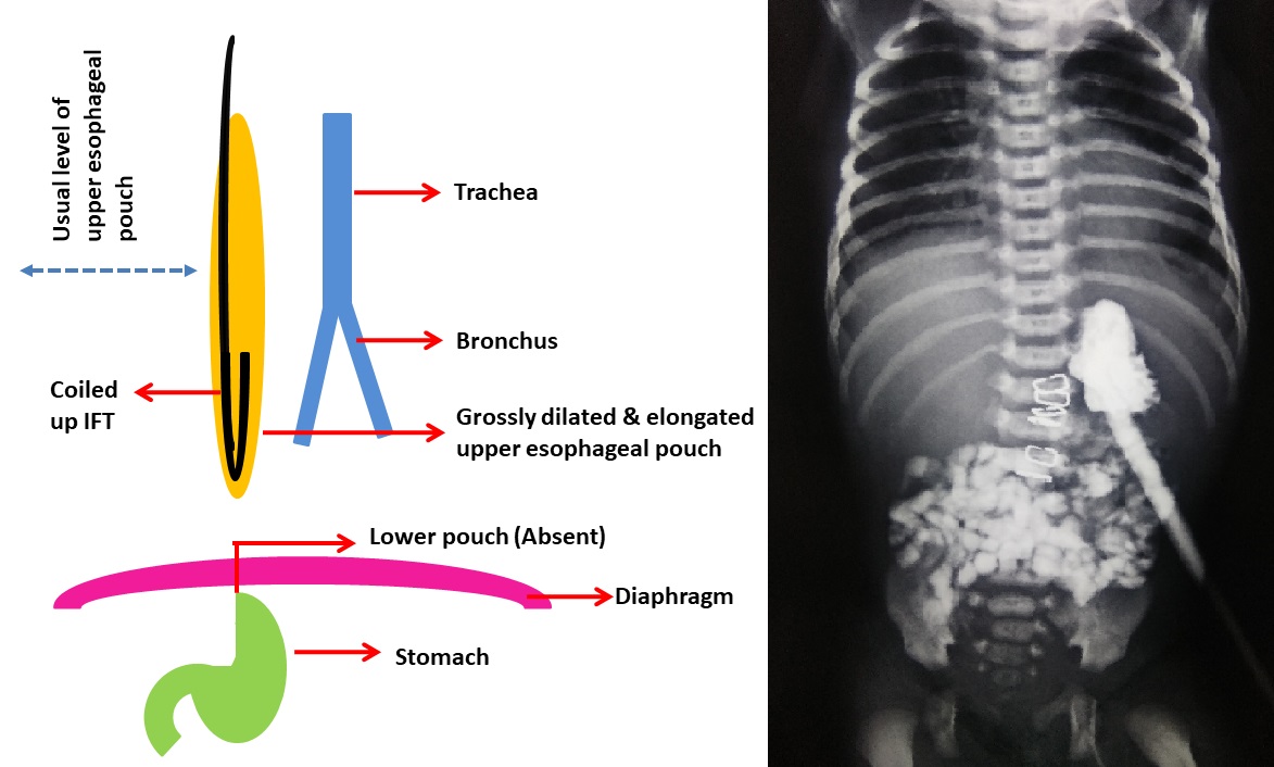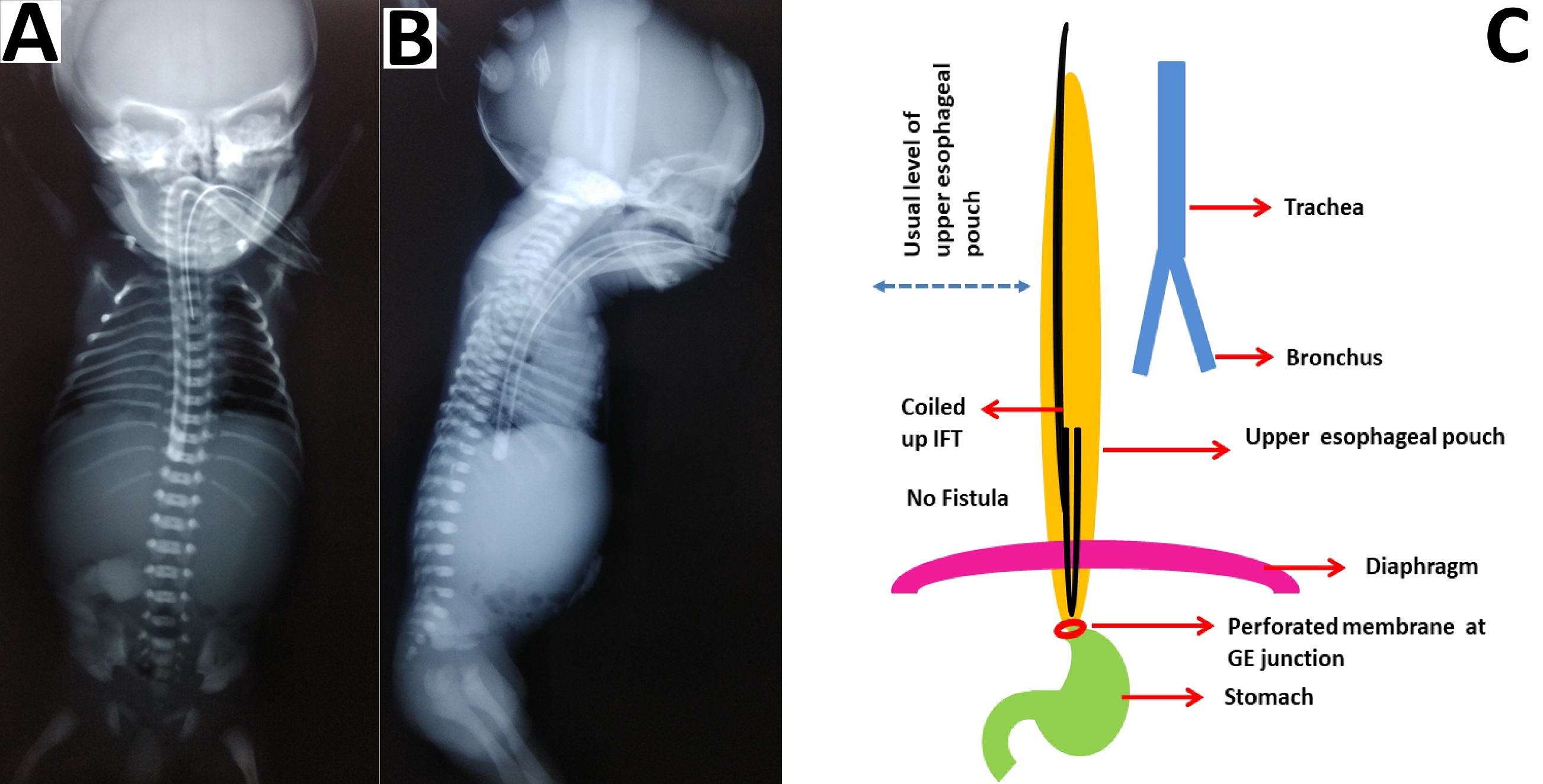Esophageal atresia (EA) encompasses a group of congenital anomalies (one in 2500 live births) comprising an interruption in the continuity of the esophagus combined with or without a persistent communication with the trachea. It is confirmed by passing no. 10 sterile, blunt‑tipped red rubber catheter into the esophagus. Failure to pass beyond 10 cm (usually) or failure to negotiate into the stomach (occasionally) is considered diagnostic of EA.[1], [2] If it does not pass beyond 10-13cm, the diagnosis of EA should be considered and confirmed by radiographs with catheter in situ.[1], [2] A red rubber catheter test must be performed to rule out EA as there are multiple fallacies of using IFT especially with long upper pouch EA.[1], [2] Kluth (1976) described an atlas of 96 variants of EA with variation from the classical presentation.[3] We describe our experience with rare Kluth variants of EA where red rubber catheter encountered obstruction below the usual level. Management of these rare variants of EA and a review of literature is presented