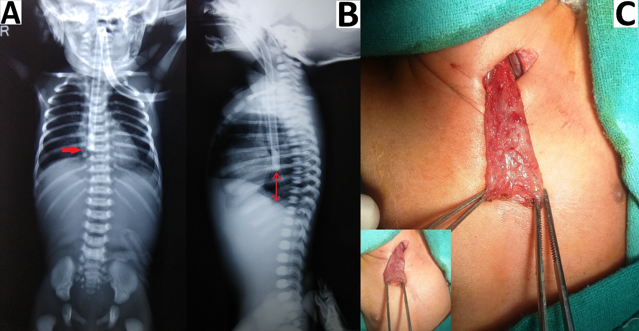 A,B) Preoperative chest radiographs (AP and lateral views; A and B) showing red rubber catheter in the esophagus arrested at the T8 vertebral level (red arrow) with absence of gas in the abdomen, C)Operative pictures(with inset image) during esophagostomy showing dilated, long, colon like upper pouch |