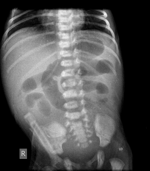 A preterm male born at 35 weeks +5 days of gestation by spontaneous vaginal delivery to a Para 4+ mother. The baby remained well after birth and had physiological jaundice that improved gradually, and baby was discharged home on day 3. On day 7, the baby was brought to the Pediatric emergency department with a history of greenish vomiting. He had five episodes of bilious vomiting, also witnessed on arrival in the emergency department. On presentation, his weight was 2.1 kg; he was active and crying, afebrile, and withoutany respiratory distress. The abdomen was distended, with generalized tenderness. Baby had normal inflammatory markers including leukocyte count and CRP. Abdominal x-ray showed dilated small bowel suggestive of intestinal obstruction with no free gas in the abdomen (Fig. 1). Abdominal Ultrasound showed only excessive gases in the epigastric area.