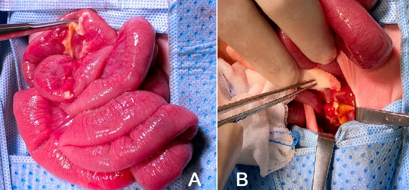 The baby was reviewed by the Pediatric surgery team, resuscitated, and booked for exploratory laparotomy with the diagnosis of small bowel obstruction. On laparotomy, there was an acutely inflamed appendix that had formed bowel adhesions and encircled a loop of small intestine causing complete small bowel obstruction with partial ischemia and bluish discoloration of the intestine (Fig. 2 A, 2B). After separation of the appendicular adhesions, an appendectomy was performed. The bowel vascularity recovered after separation of the adhesions. The baby had an uneventful recovery and was discharged home in stable condition and remained well at follow up visits.